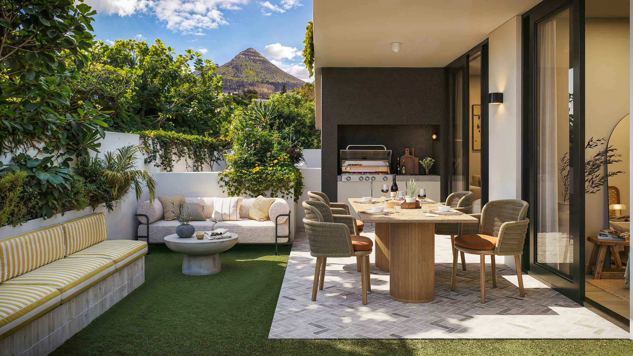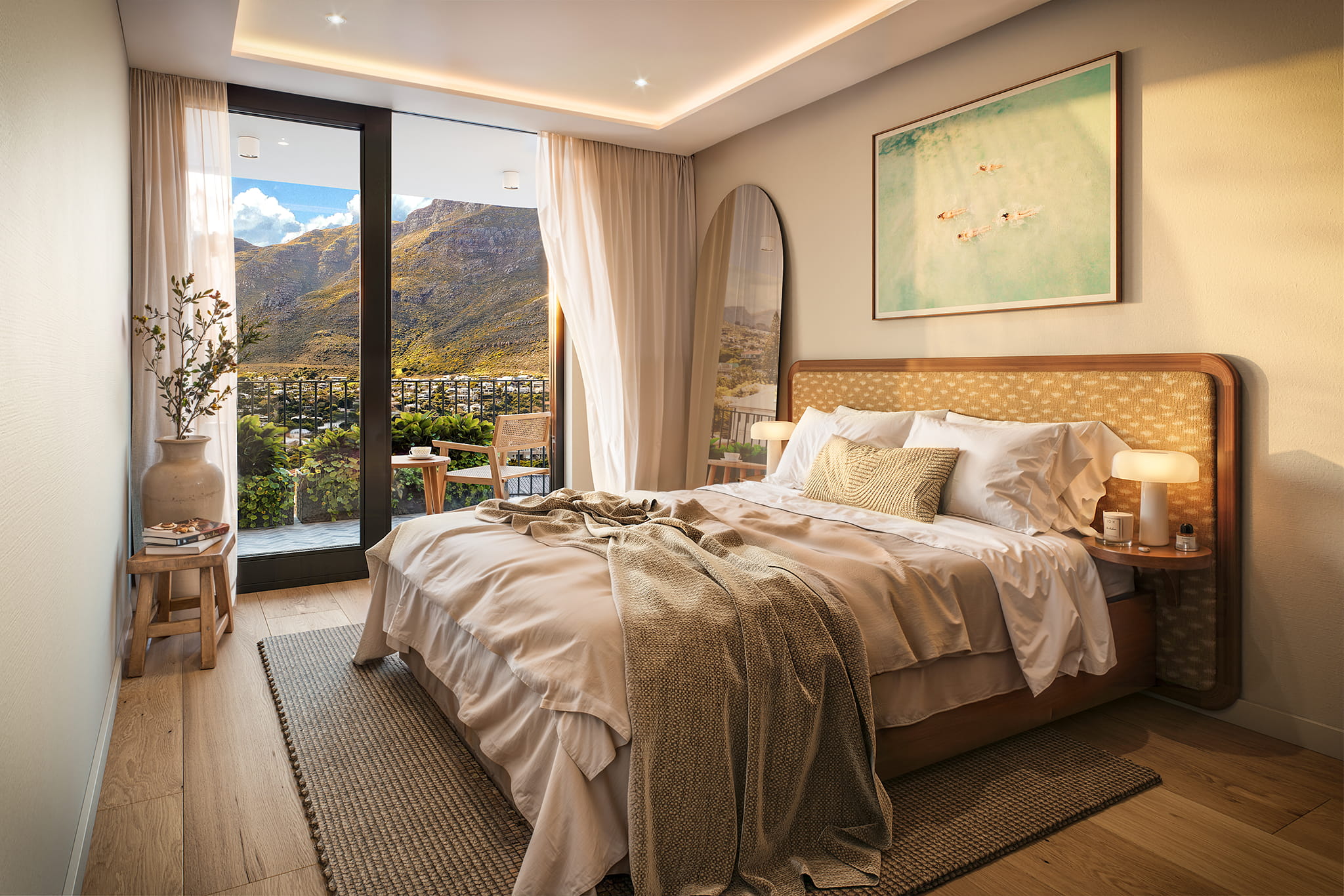Every apartment apartments a private balcony, with select homes including a built-in braai - perfect for enjoying mountain and ocean views or quiet moments at home. Interiors are finished in sandy, neutral tones, layered with soft woods, subtle tiling, and a minimalist palette that fosters a sense of tranquillity.
